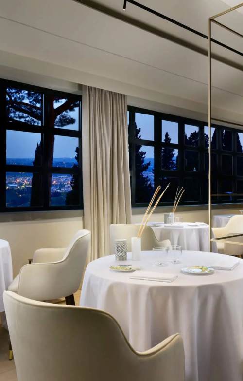 L’eleganza della sala contemporary chic del ristorante a Fiesole, la cucina a vista e lo skyline della città di Firenze sullo sfondo definiscono ambienti interni luminosi con visuale en plein air.